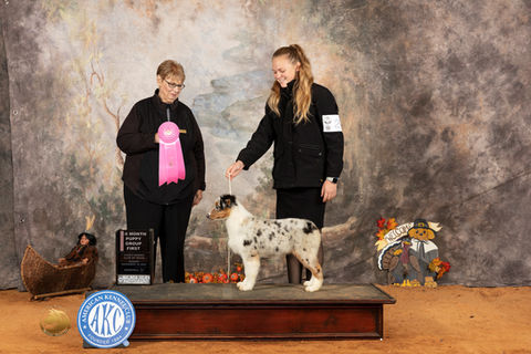 If a registered name ever was so fitting – Justice is just that! She is EVERYTHING Nice! This baby girl we cannot wait to see her ability come to light. The cross was so successful the first time around – we did it again with currently 5 of the litter of 8 registered for USASA Futurity. At the ripe age of barely 4 months old – her very first confirmation show was Marshall, TX late fall of 2023 and did she deliver! Not only was she Best of Breed Puppy – but then won a prestigious Group 1st placement with Junior Peytyn Pratt on the end of her lead. She loves the ring much like her two older brothers Mack & Al! this January 2024 we then took her to her first ever AKC outing – just 6 mos. and 2 days old – being awarded Winners Bitch & Best of Winners for her first major and points. Then, we took her to her first ever ASCA show in Sanger, TX where she was awarded Reserve Winners Bitch to a 5 point major – not once – but twice (one was behind Smooch where she finished her ASCA Championship!). This lil’ blue superstar is following close in her #BluBros paw prints and has all the pieces to just knock it out of the park! She is every so lovingly sweet like her mother Navy with her sire Jagger’s grit and determination. She is a force to be reckoned with and her future is so exciting! Watch for her in Kerrville, TX and the Ft. Worth, TX USASA Specialty here in March 2024! #GobabyJustice!